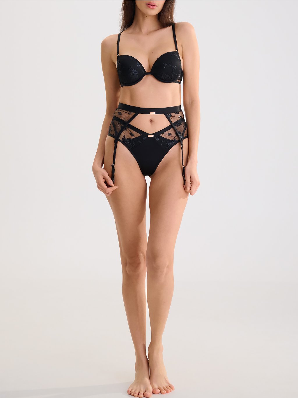 Přední část zdobí bohatá, jemně lesklá výšivka, která dodává modelu romantický a sofistikovaný vzhled. Kovová ozdoba v pase pak podtrhuje elegantní charakter celého prádla.