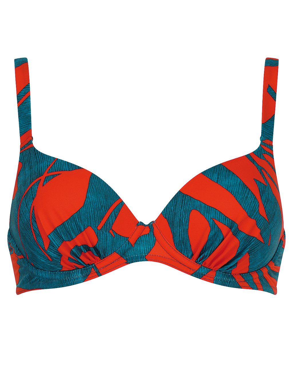 Dopřejte si plavkový vršek, který kombinuje styl, jistotu a pohodlí. Tato plavková podprsenka vyztužená SUNFLAIR 2026 21003/2867 zaujme výrazným tropickým vzorem v kombinaci tyrkysové a sytě oranžové barvy a zároveň nabídne krásné tvarování poprsí bez zbytečného přehánění. Elegantní, ženská a spolehlivá – přesně taková, jakou u vody chcete.