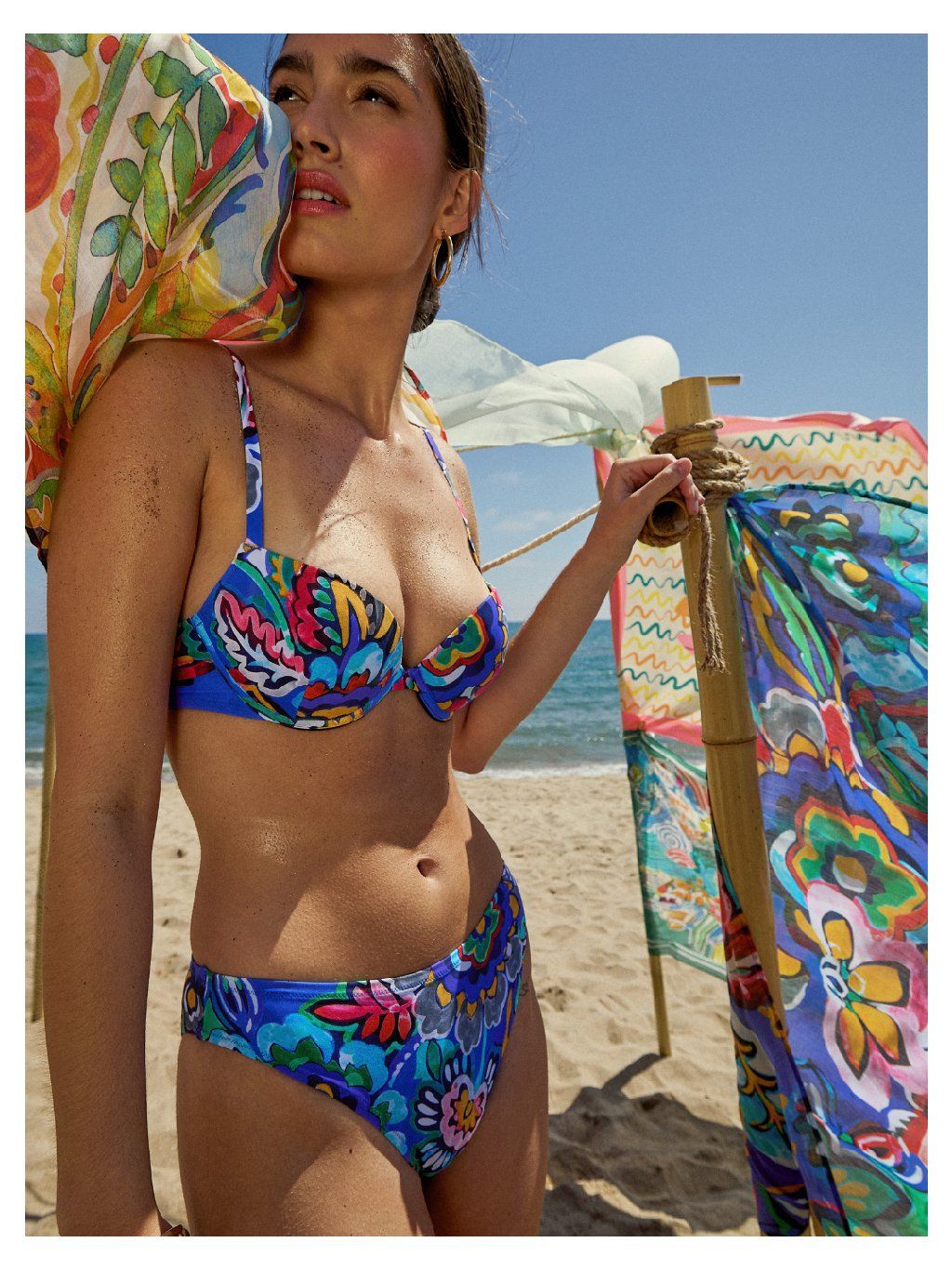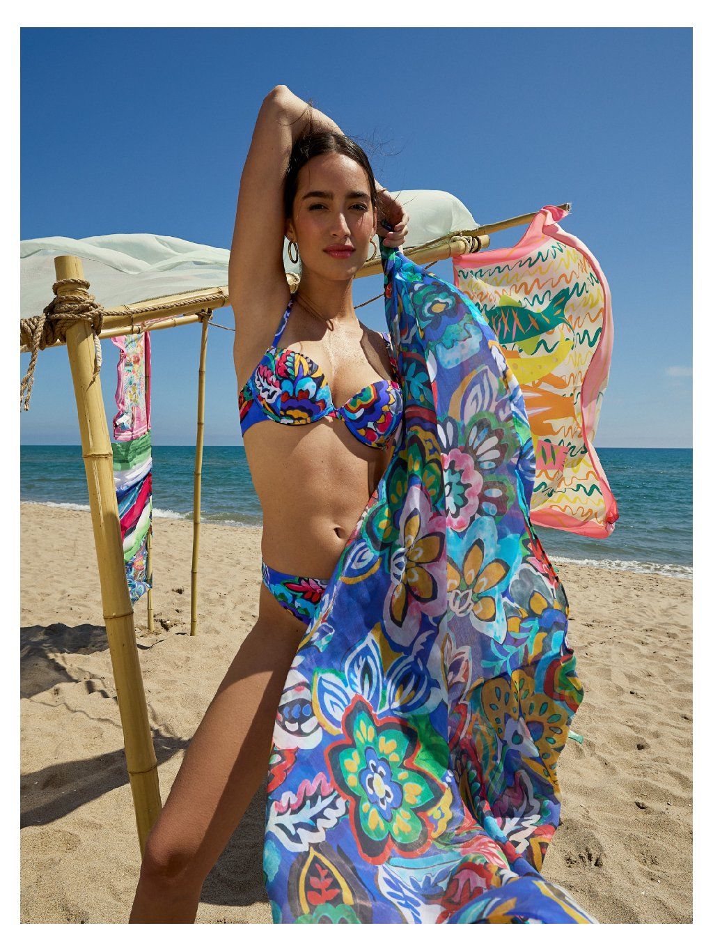 Push-up efekt krásně zvýrazní dekolt a dodá prsou objem. Kostice zajistí stabilní oporu i při pohybu. Odnímatelná ramínka umožní variabilní styling. Výrazný vícebarevný motiv s modrými tóny působí svěže a moderně. Rychleschnoucí materiál je ideální pro koupání i opalování.