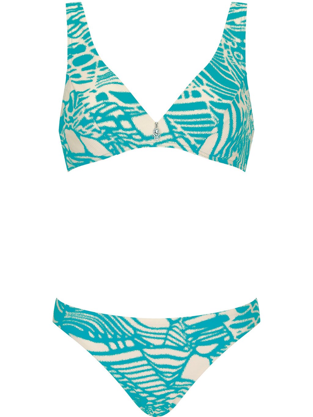 Tyrkysový vzor inspirovaný tropickými motivy působí svěže, moderně a na opálené pokožce naprosto zářivě. Spodní díl se středně vysokým sedem lichotí postavě a komfortní elastický materiál se přizpůsobí každému pohybu—ideální na pláž, do lázní i k bazénu.
