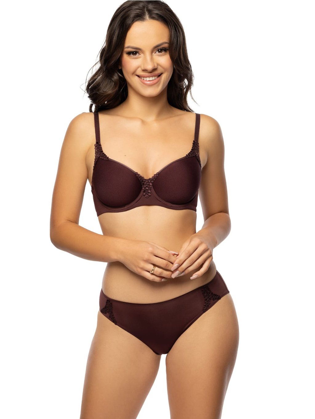 Nastavitelná ramínka, střední střed mezi košíčky a pohodlné zapínání na háčky (2–3 pozice dle velikosti) zajišťují, že padne jako ulitá. Elastický obvod se nevytahuje a drží tvar i po mnoha praních.