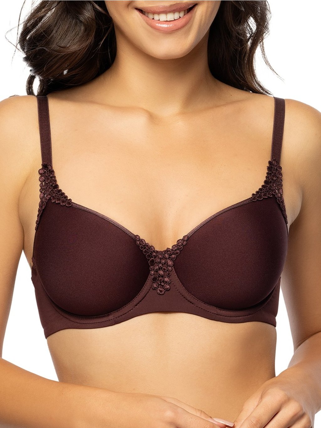 Košíčky s jemnou výztuží a měkké kostice zajišťují pevnou, ale pohodlnou oporu i ve větších velikostech. Konstrukce podprsenky rozkládá váhu rovnoměrně, takže se ramínka nezařezávají a záda netrpí.